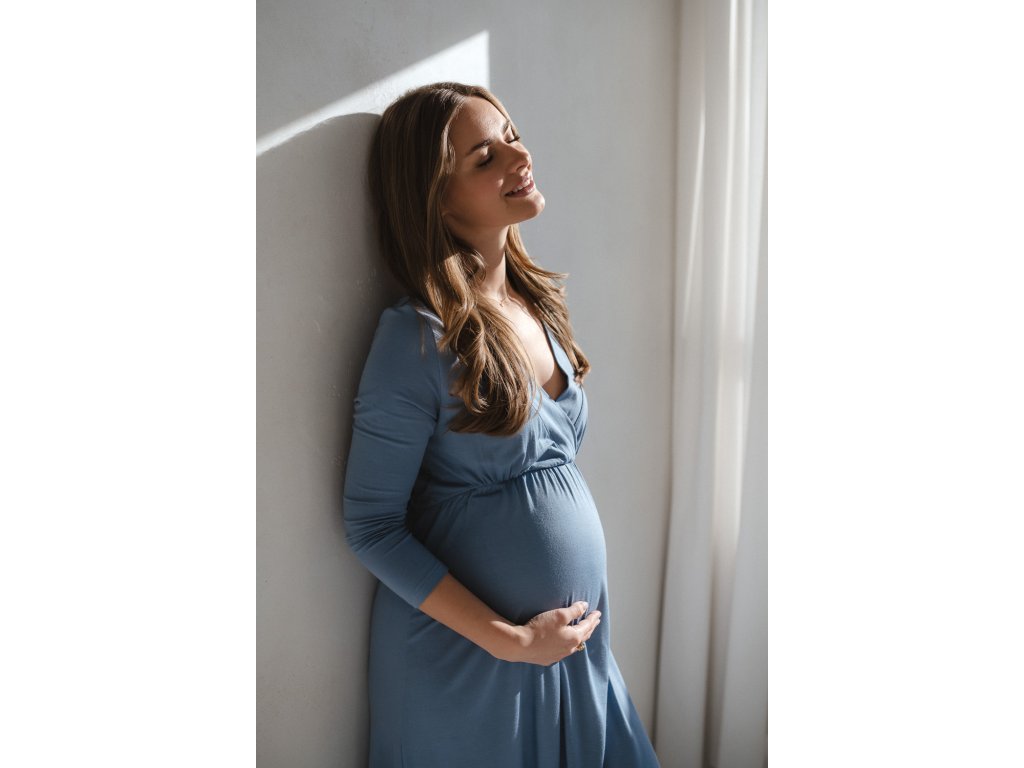Díky výstřihu do V a rozšířenému spodnímu lemu se košile snadno přizpůsobí rostoucímu bříšku 🤰 a její délka pod kolena zajišťuje pohodlí v každé situaci 👗. Ideální jak na večerní chvíle odpočinku 🌙, tak i jako košile do porodnice 🏥.